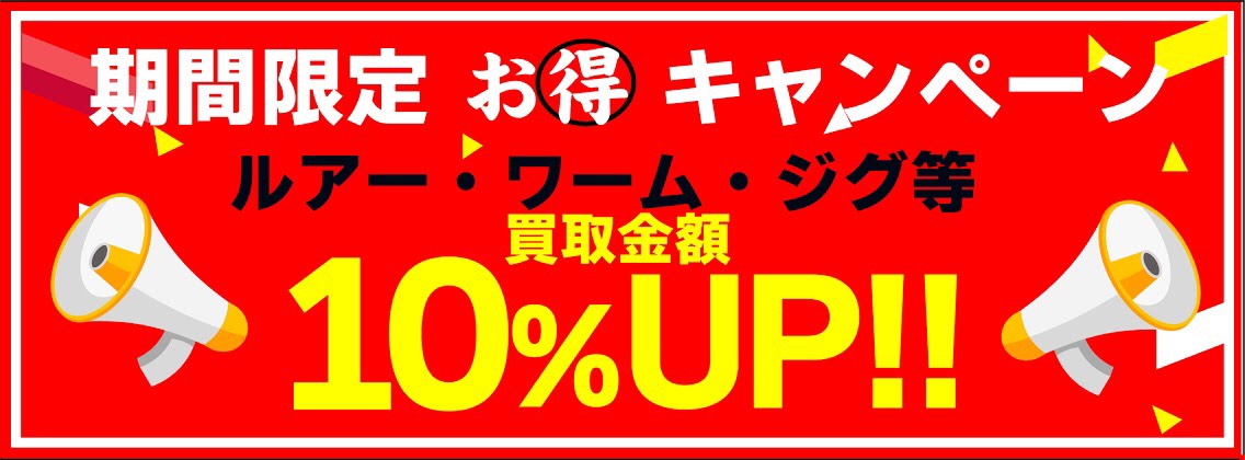 また、現在もルアー買取10%UPキャンペーン実施中!期間はまだ未定ですが、いつ終わるか分からないため、お早めにご利用ください!