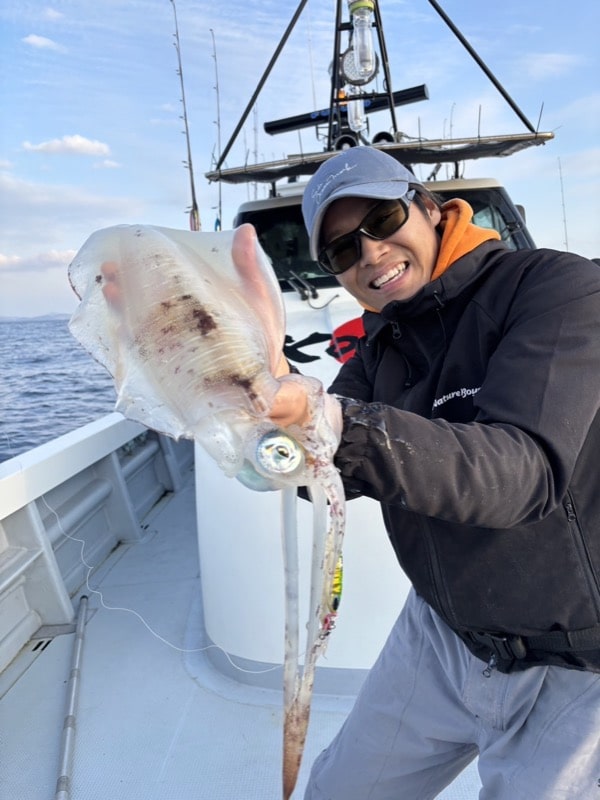 水深60mでボトムを取った直後、まさかのアオリイカがヒット🦑!